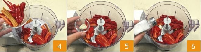 Geben Sie die geschnittenen und entkernten Chilis in einen Mixer 4, fügen Sie eine geschälte Knoblauchzehe hinzu 5 und salzen Sie nach Geschmack 6.