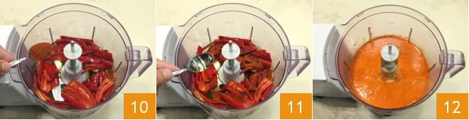 Fügen Sie das süße Paprikapulver 10 und den Essig hinzu 11. Zu diesem Zeitpunkt den Mixer für einige Sekunden einschalten, bis eine dichte und homogene Mischung entsteht 12, die Sie im Kühlschrank aufbewahren, bis Sie sie verwenden.