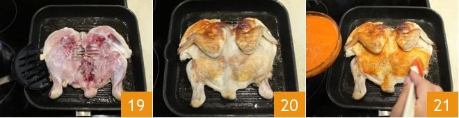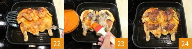 Nach dieser Zeit drehen Sie das Hähnchen mit Hilfe eines Pfannenwenders auf die andere Seite (19-20) und braten Sie es weitere 20 Minuten bei starker Hitze, ohne ein Gewicht darauf zu legen. Nehmen Sie dann die Piri-Piri-Soße, die Sie beiseitegelegt haben, und bestreichen Sie die gesamte Oberfläche des Hähnchens 21.