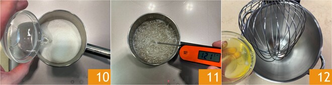 Kümmern Sie sich nun um die Zubereitung der italienischen Meringue. Geben Sie Zucker und Wasser in einen kleinen Topf 10 und erhitzen Sie sie bis 121°C 11. In der Zwischenzeit schlagen Sie die Eiklar in der Küchenmaschine mit den Quirlen auf 12.