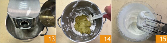 Geben Sie den 121°C heißen Sirup nach und nach dazu 13 und schlagen Sie weiter. Sobald die Meringue fertig ist, fügen Sie die Pistaziencreme hinzu und heben Sie sie mit Bewegungen von unten nach oben unter 14. Separat schlagen Sie die 300 g frische Sahne halb steif 15.