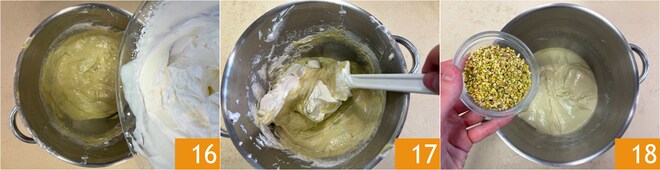 Fügen Sie sie zur Meringue hinzu 16 und heben Sie sie mit Bewegungen von unten nach oben unter 17, um die Masse nicht zu entlüften. Geben Sie die gehackten Pistazien hinzu 18, rühren Sie noch einmal und stellen Sie sie beiseite.
