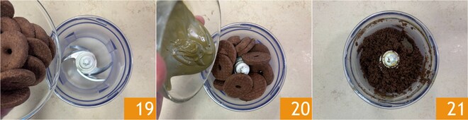 Bereiten Sie nun die Basis vor. Geben Sie die Kekse in einen Mixer 19, fügen Sie die Pistaziencreme hinzu 20 und mixen Sie, bis eine homogene und sandige Konsistenz erreicht ist 21.