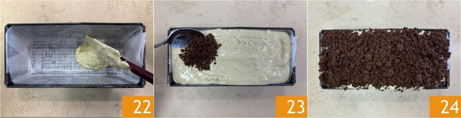 Geben Sie die Meringue-Mischung in eine rechteckige Form von 26x9 cm, die mit Butter eingefettet und mit Backpapier ausgelegt ist 22. Bedecken Sie die Oberfläche mit den zerbröselten Keksen 23 24 und lassen Sie sie 6 Stunden im Kühlschrank ruhen.