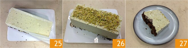 Stürzen Sie die Form und entfernen Sie das Backpapier 25. Bestreuen Sie die Oberfläche mit gehackten Pistazien 26. Ihr Pistazien-Semifreddo ist bereit zum Servieren 27.