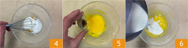 Rühren Sie 4, bis eine homogene Masse entsteht, geben Sie dann den Vanilleextrakt 5, die Milch und die Sahne hinzu 6.
