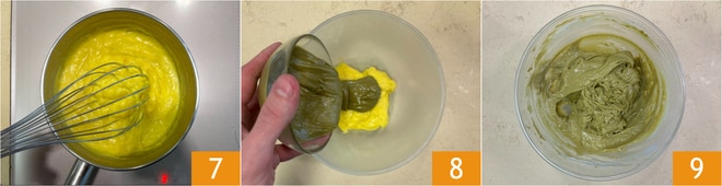 Rühren Sie erneut und geben Sie die Mischung in den Topf. Lassen Sie die Creme bei niedriger Hitze eindicken, dabei ständig rühren 7. Gießen Sie die Creme in eine Schüssel und fügen Sie die Pistaziencreme hinzu 8, rühren Sie, bis eine homogene Masse entsteht 9. Mit Frischhaltefolie abdecken und beiseite stellen.