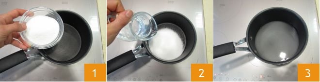 Um das Pistazieneis ohne Eismaschine zuzubereiten, beginnt ihr mit dem Sirup: Gebt den Zucker 1, das Wasser 2 in einen kleinen Topf und stellt die Flamme auf niedrige Hitze 3.