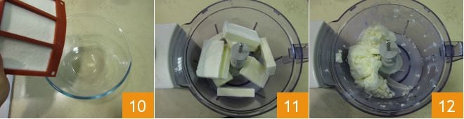 An diesem Punkt entnehmt die Würfel aus der Form 10 und gebt sie in eine Küchenmaschine 11. Püriert alles, bis ihr eine cremige Masse erhaltet 12,