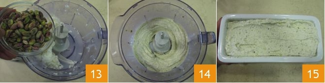 fügt die Pistazien hinzu 13 und püriert weiter, bis ihr eine glatte Creme erhaltet 14. Füllt die Mischung in einen Behälter (am besten aus Aluminium, Keramik oder Glas. Plastik vermeiden) 15 und stellt sie für mindestens 6 Stunden ins Gefrierfach. Beim Servieren nehmt das Eis 5-10 Minuten vorher aus dem Gefrierfach und arbeitet es mit einem Löffel, indem ihr nach und nach schabt, bis ihr es wieder zu einer cremigen Konsistenz mischen könnt. Für eine noch cremigere Konsistenz könnt ihr das Eis erneut im Mixer mit den Klingen verarbeiten.