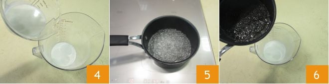 In der Zwischenzeit gebt sowohl die Milch als auch die Sahne in einen Krug 4. Sobald der Sirup zum Kochen kommt 5, schaltet die Hitze aus und lasst ihn abkühlen. Gebt den Sirup in die Milch-Sahne-Mischung 6