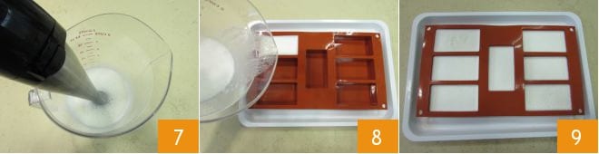 und mixt alles mit einem Stabmixer 7. Füllt die Mischung in eine Silikonform 8 (oder in Eiswürfelformen). Gebt es ins Gefrierfach und lasst es mindestens eine Nacht gefrieren 9.