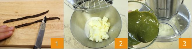 Um den Pistazienkuchen vorzubereiten, beginnen Sie mit der Vanilleschote, öffnen Sie sie in zwei Hälften, extrahieren Sie die Samen und bewahren Sie diese auf 1; alternativ können Sie ein Päckchen Vanillezucker verwenden. Geben Sie in die Schüssel einer Küchenmaschine mit Schneebesen die weiche Butter zusammen mit dem Zucker 2 und mischen Sie alles, indem Sie die Maschine einschalten. Wenn die Küchenmaschine läuft, fügen Sie auch die Samen der Vanilleschote zur Butter-Zucker-Mischung hinzu und geben Sie die Pistazienpaste dazu 3 (wenn Sie keine Pistazienpaste finden, können Sie sie selbst herstellen, indem Sie geschälte Pistazien fein mahlen),