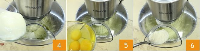 den Joghurt 4, die Eier einzeln 5 und das Salz. Wenn die Eier mit der Mischung vermischt sind, geben Sie auch das gesiebte Mehl und das Backpulver hinzu 6