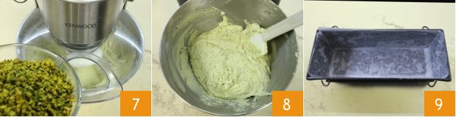 und zuletzt die gehackten Pistazien 7; lassen Sie alles vermischen, bis eine dichte und homogene Masse entsteht 8. Wenn Sie keine Küchenmaschine haben, können Sie einen Schneebesen verwenden, achten Sie darauf, die Zutaten nach und nach hinzuzufügen, um Klumpen zu vermeiden. Fetten Sie eine Kuchenform von 30x10x8 cm (mit einem Fassungsvermögen von 1,5 Litern) ein und legen Sie sie mit Backpapier aus, indem Sie es gut an den Wänden andrücken, damit das Papier an allen Seiten haftet 9.