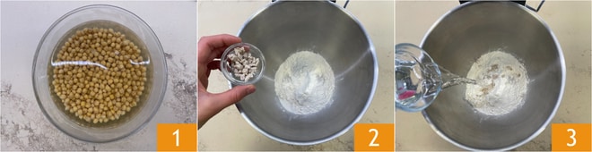 Um die Pita mit Falafel zuzubereiten, legen Sie zuerst die Kichererbsen in kaltes Wasser ein 1 und lassen sie für 12 Stunden oder über Nacht einweichen. In einer Küchenmaschine geben Sie das Mehl, fügen die zerbröckelte Hefe 2 und das Wasser hinzu 3,