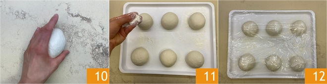 Zum Schluss rollen Sie die Teiglinge rund 10. Legen Sie die Teiglinge auf ein leicht bemehltes Backblech, bestäuben Sie sie mit mehr Mehl 11 und decken Sie sie mit Frischhaltefolie ab 12. Lassen Sie sie 1 Stunde an einem trockenen, zugluftgeschützten Ort gehen.