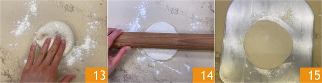 Verlegen Sie die Teiglinge auf die leicht bemehlte Arbeitsfläche, fügen Sie mehr Mehl auf die Oberfläche hinzu und drücken Sie sie zuerst mit den Fingerspitzen flach 13, dann rollen Sie sie mit einem Nudelholz 14 zu Scheiben von etwa 20 cm Durchmesser 15.
