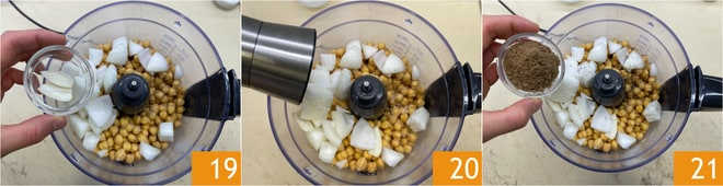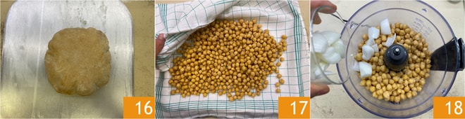 Nun können Sie sie auf einem vorher erhitzten Backstein oder einfach auf einem Backblech in einem statischen Ofen bei 250°C für 10 Minuten backen, bis sie schön aufgeblasen und goldbraun sind 16. Beiseitelegen. Um die Falafel zuzubereiten, die Kichererbsen abtropfen lassen, abspülen und mit einem sauberen Tuch gut abtupfen 17, sie müssen für die richtige Konsistenz des Teigs vollkommen trocken sein. Zur Sicherheit können Sie sie weitere 10 Minuten in einem Umluftofen bei 100°C trocknen. In einen Mixer geben und die in Stücke geschnittene Zwiebel hinzufügen 18.
