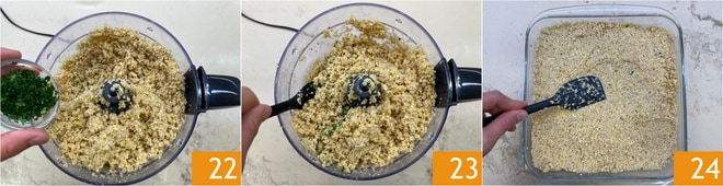 Mixen Sie, bis eine grobe Konsistenz erreicht ist, fügen Sie die gehackte Petersilie hinzu 22 und mischen Sie 23. Hacken Sie die Petersilie separat und fügen Sie sie dann der Mischung hinzu. Es ist wichtig, sie separat zu hacken, da sie zu viel Wasser freisetzen würde, wenn sie im Ganzen in den Mixer gegeben würde, was die Konsistenz beeinträchtigen würde. Alles in eine Schüssel geben und gut festdrücken 24. Mit Frischhaltefolie abdecken und mindestens 1 Stunde im Kühlschrank ruhen lassen.