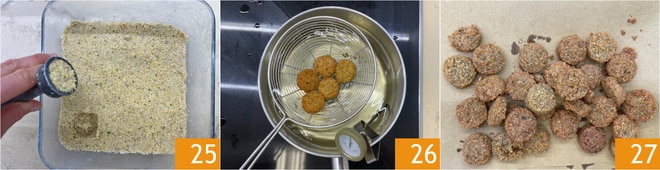 Formen Sie die Falafel mit einem speziellen Werkzeug 25; alternativ können Sie es von Hand machen: Nehmen Sie kleine Portionen des Teigs und drücken Sie diese leicht zwischen den Handflächen, achten Sie darauf, sie gut zu verdichten. Verfahren Sie so weiter, bis die Mischung verbraucht ist; mit diesen Mengen erhalten Sie etwa fünfzig Stück. Frittieren Sie sie in Pflanzenöl bei 170°C für 4-5 Minuten. Frittieren Sie nur ein paar auf einmal, um die Öltemperatur nicht zu stark zu senken. Mit einem Schaumlöffel abtropfen lassen 26 und auf Küchenpapier legen 27, um überschüssiges Öl zu entfernen.