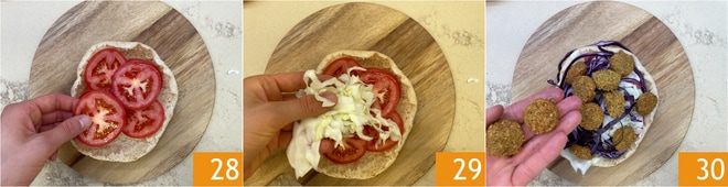 Jetzt können Sie Ihre Pitas füllen, zum Beispiel mit Tomaten 28, Weißkohl 29 und Rotkohl. Die Falafel auf den Kohl legen 30.