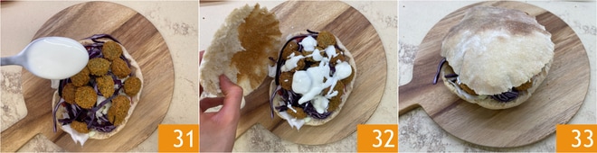 Mit Naturjoghurt 31 abschließen und die Pita schließen 32. Ihre Pita mit Falafel ist bereit, genossen zu werden 33!