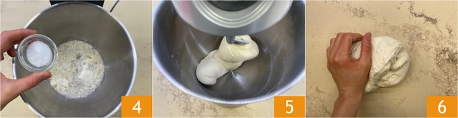 Fügen Sie auch das Salz hinzu 4, montieren Sie den Knethaken und kneten Sie, bis ein glatter Teig entsteht 5. Den Teig auf die leicht bemehlte Arbeitsfläche legen und ein paar Falten einarbeiten 6, um ihn glatter zu machen.