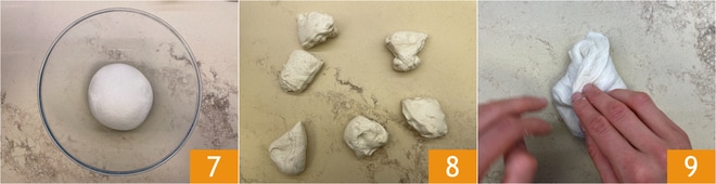 Legen Sie den Teig in eine Schüssel 7, decken Sie ihn mit Frischhaltefolie ab und lassen Sie ihn an einem trockenen Ort, geschützt vor Zugluft, etwa 2 Stunden und 30 Minuten gehen, bis er sein Volumen verdoppelt hat. Teilen Sie den Teig in 6 Stücke von jeweils etwa 130 g 8. Drücken Sie sie leicht flach und ziehen Sie die Ecken nach innen 9.