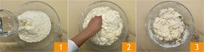 Um die frittierte Pizza zuzubereiten, geben Sie zunächst das Mehl und 550 g Wasser in eine große Schüssel 1, und kneten Sie dann mit den Händen 2, bis die Flüssigkeit aufgenommen wurde 3. Decken Sie die Mischung mit der Schüssel ab und lassen Sie sie eine Stunde bei Raumtemperatur ruhen.