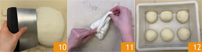 Nach dieser Zeit teilen Sie den Teig mit einem Teigschaber in 6 Portionen à 250 g 10. Geben Sie jeder Portion Verstärkungsfalten, indem Sie die Ränder nach außen ziehen und zur Mitte hin falten 11, und formen Sie den Teig auf der Arbeitsfläche zu Kugeln. Legen Sie die Kugeln in eine Gärbox, wobei Sie etwas Abstand zwischen ihnen lassen 12. Decken Sie sie mit dem Deckel ab und lassen Sie sie etwa 2 Stunden oder bis zur Verdopplung des Volumens gehen.
