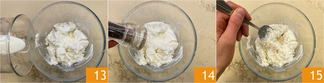 Inzwischen können Sie sich um die Zutaten für die Füllung kümmern: Geben Sie die Ricotta und die Milch in eine Schüssel 13, salzen und pfeffern Sie 14, und vermengen Sie alles gut mit einem Löffel 15.