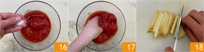 Würzen Sie die Tomaten mit einer Prise Salz 16 und zerdrücken Sie sie mit den Händen 17. Reduzieren Sie den geräucherten Scamorza in Streifen 18.