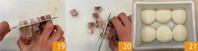 Schneiden Sie schließlich die Cicoli zuerst in Scheiben 19 und dann in Würfel 20. Nach der Ruhezeit ist das Volumen der Teiglinge verdoppelt 21.