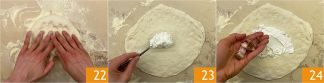 Bestäuben Sie die Arbeitsfläche mit Grieß und rollen Sie den Teig mit den Fingerspitzen aus 22, bis Sie einen Durchmesser von 30 cm erreicht haben 22. Verteilen Sie in der Mitte einen Löffel Ricotta 23, und fügen Sie eine Handvoll Cicoli hinzu 24.
