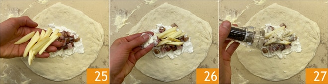 Fahren Sie fort mit dem Scamorza 25, dem geriebenen Pecorino 26, und einer großzügigen Portion frisch gemahlenem Pfeffer 27.