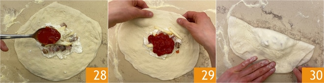 Würzen Sie schließlich mit einem Löffel Tomaten 28. Schließen Sie den Teig zu einem Halbmond 29 und drücken Sie die Ränder mit den Fingern, um sie zu versiegeln 30. Verfahren Sie auf diese Weise, um alle Pizzen zu füllen.
