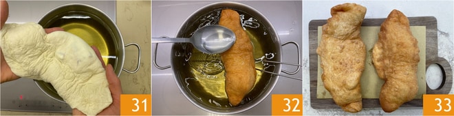 Sie sind bereit zum Frittieren: Erhitzen Sie das Samenöl in einem großen Topf bis zu einer Temperatur von 170°-175°, und tauchen Sie dann jeweils eine gefüllte Pizza ein 31. Frittieren Sie für 6-8 Minuten und helfen Sie mit einem Löffel, auch die Oberfläche mit Öl zu bedecken 32. Wenn sie schön goldbraun ist, heben Sie sie heraus und legen Sie sie auf Backpapier. Ihre frittierte Pizza mit Ricotta und Cicoli ist bereit zum Genießen 33!