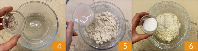 Nach der Ruhezeit zerkrümeln Sie die Hefe in die verbleibenden 100 g Wasser 4, rühren Sie, um sie vollständig aufzulösen, und fügen Sie sie dem Teig hinzu 5. Kneten Sie mit den Händen, um die Flüssigkeit aufzunehmen, und fügen Sie dann das Salz hinzu 6.