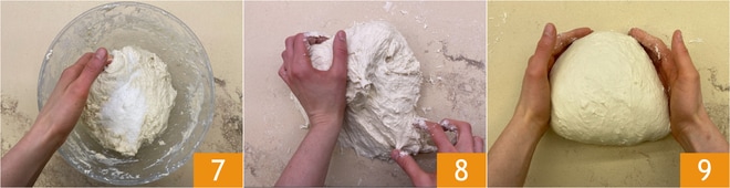 Arbeiten Sie weiter im Schüssel 7 und dann auf der Arbeitsfläche 8, bis der Teig nicht mehr klebrig ist. Formen Sie einen Teigballen 9, decken Sie ihn mit der Schüssel ab und lassen Sie ihn etwa 30 Minuten bei Raumtemperatur ruhen.