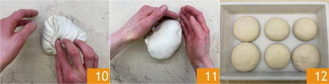 Nehmen Sie jedes dieser Stücke und ziehen Sie die Enden von außen nach innen 10, dann rollen Sie sie zu Kugeln 11. Legen Sie die Kugeln in eine Gärbox, decken Sie sie mit einem Deckel ab und lassen Sie sie 6-8 Stunden bei einer Temperatur von etwa 18°-24° gehen 12.