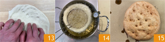Nach der Gehzeit rollen Sie die Teigkugeln auf einer leicht bemehlten Arbeitsfläche aus, indem Sie sie leicht mit den Fingerspitzen drücken und so wenig wie möglich berühren; Sie sollten einen Kreis mit einem Durchmesser von etwa 22 cm formen 13. Frittieren Sie sie dann in Samenöl bei 180° 14; für eine gleichmäßige Garung gießen Sie das heiße Öl mithilfe einer Kelle über die Oberfläche der Pizza. Frittieren Sie sie 5-7 Minuten, indem Sie sie zur Hälfte der Garzeit wenden. Sobald sie fertig sind, legen Sie die frittierten Pizzen auf Küchenpapier, um das überschüssige Öl zu entfernen 15.