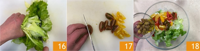Bereiten Sie in der Zwischenzeit die Füllung vor: Schneiden Sie die krause Endivie in Stücke 16 und die Kirschtomaten in Viertel 17. Geben Sie sie in eine Schüssel und fügen Sie die Oliven hinzu 18.