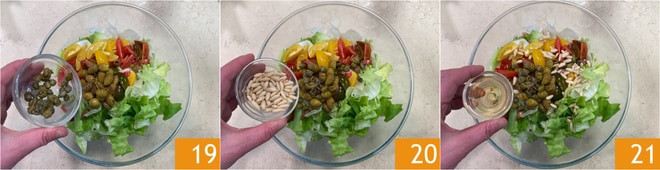 Fügen Sie die Kapern 19, die Pinienkerne 20 und die Sardellenessenz 21 hinzu.