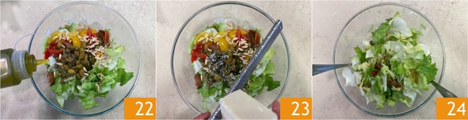 Gießen Sie das Öl 22 dazu, fügen Sie den geriebenen Pecorino 23 hinzu und mischen Sie alles gut 24.