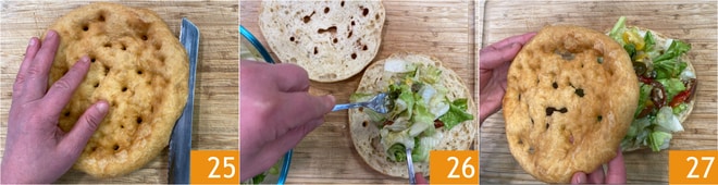 Teilen Sie die Pizzen in der Mitte 25 und füllen Sie sie mit der Füllung 26. Zuletzt backen Sie die gefüllten Pizzen im Ofen bei 200° für 4-5 Minuten nach. Ihre frittierte Pizza mit Endivie ist bereit, um genossen zu werden 27!