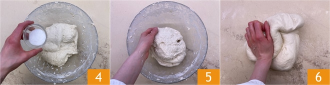 Fügen Sie das Salz 4 hinzu und kneten Sie weiter, um es einzubinden 5. Wechseln Sie auf die Arbeitsfläche und bearbeiten Sie den Teig ca. 20 Minuten 6, bis er glatt und homogen ist.