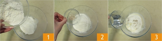 Um die Pizza mit gelben Kirschtomaten, Sardellen und Kapern zuzubereiten, beginnen Sie mit dem Teig. Geben Sie die Mehle 1 und die zerbröselte Hefe 2 in eine Schüssel. Fügen Sie das Wasser nach und nach hinzu 3,