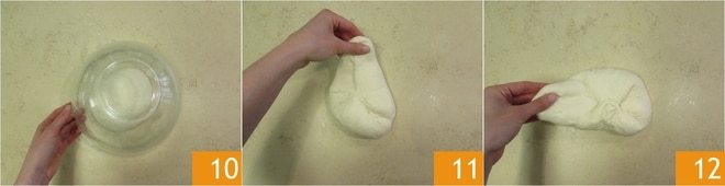 Decken Sie ihn nun mit der sauberen Schüssel ab und lassen Sie ihn für etwa zehn Minuten auf der Arbeitsfläche 10. Nach dieser Zeit geben Sie ihm eine Runde Faltungen. Stellen Sie sich vor, die Kugel wäre in 4 Teile geteilt, nehmen Sie das Ende von jedem, ziehen Sie es vorsichtig 11 und falten Sie es zur Mitte 12.