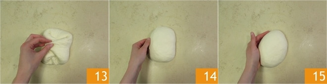 Wiederholen Sie diesen Vorgang für alle 4 Enden 13, drehen Sie dann den Teig um 14 und formen Sie eine Kugel 15.